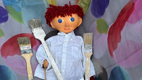 Deshalb springt er auf, läuft flugs nach Hause. In aller Eile kramt er ein altes Hemd aus dem Schrank, damit er sich nicht bekleckert. Besorgt sich große Malerpinsel und verschiedene Farben aus dem Keller, schleppt alles zur Münsterkirche. Dort malt er einen bunten Kreis nach dem anderen. Betrachtet sein Werk, legt sich mitten hinein, träumt vor sich hin. Das gefällt ihm alles noch nicht. Er hat einen neuen Einfall. Flott holt er seine leuchtenden, bunten Malstifte, mit denen er sich nicht bekleckert. Er will weiße Fahnen bemalen. Habt Ihr Lust, dann kommt vorbei und macht mit. Bemale zu Deinen Wünschen und Ideen eine Fahne, Deine Traumfahne. Bringt Eure Eltern oder eine andere erwachsene Begleitperson mit. Am Samstag, 08.08.2026 von 11.30 Uhr bis 13.30 Uhr im Paradieseingang der Münsterkirche. Eure fertige Traumbildfahne tragt Ihr dann nach Hause.