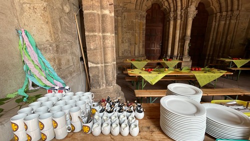 Gemeinsam essen, mitten im Geschehen, vor Regen, Wind und Sonne geschützt, im Paradies-Eingang der Münsterkirche.